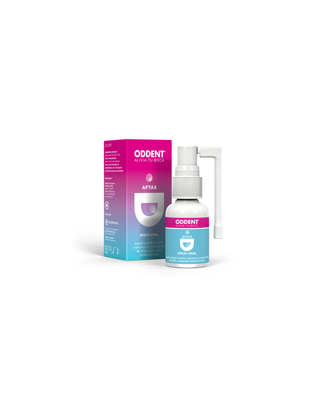 El Spray Oral de ODDENT® ayuda a aliviar el dolor y favorece la cicatrización de llagas y pequeñas heridas bucales, con una aplicación muy cómoda. Contiene ácido hialurónico sintetizado biotecnológicamente y se aplica directamente sobre el tejido gingival o la zona a tratar.