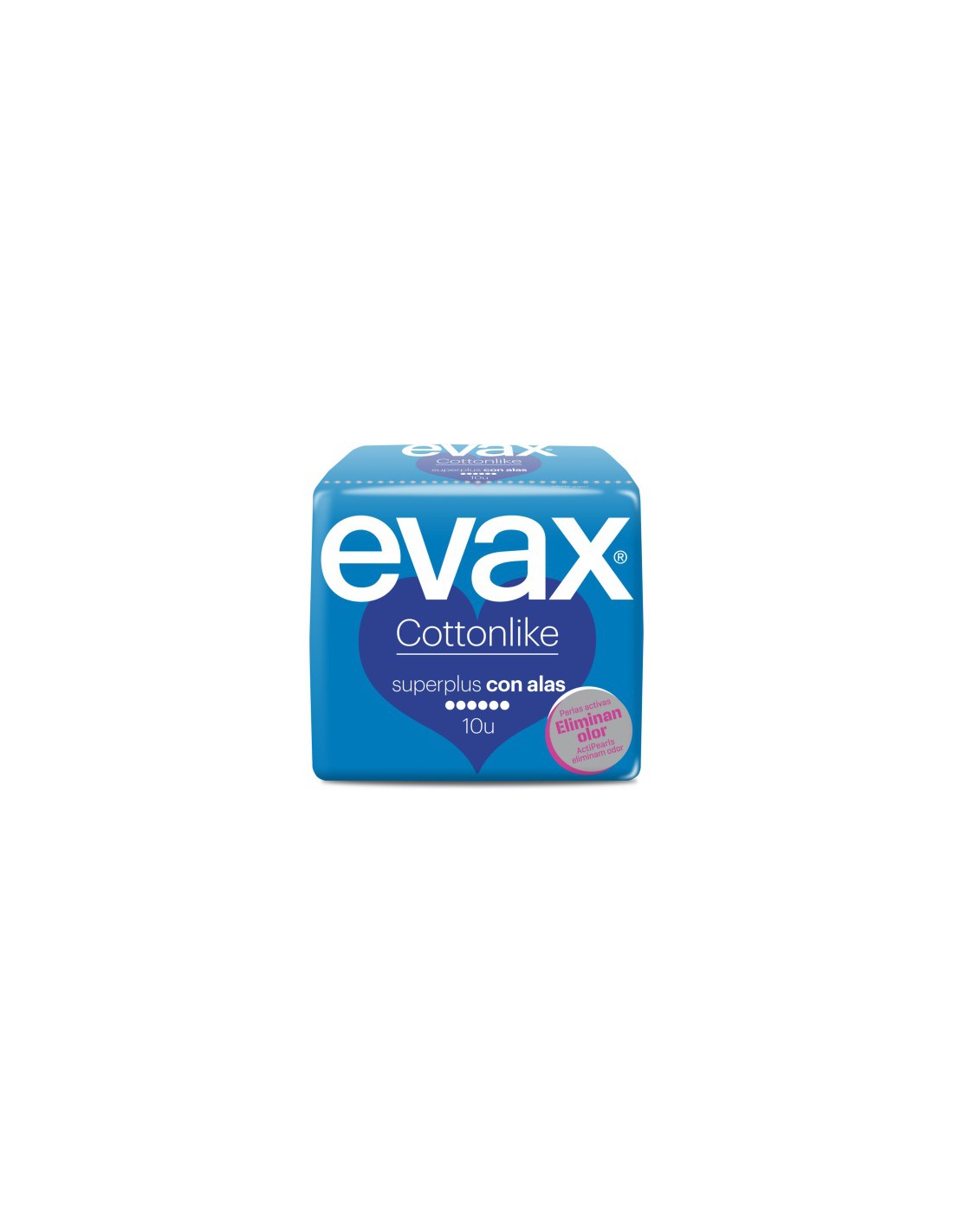 Compresas Evax Cottonlike Superplus Alas 10unidades. Eliminan el olor. Super aboserbentes. Ideal para la noche: no te mancharás aunque te muevas. También para un flujo abundante si quieres estar tranquila. Disfruta de una mayor sujeción y protección lateral de las braguitas gracias a sus alas.