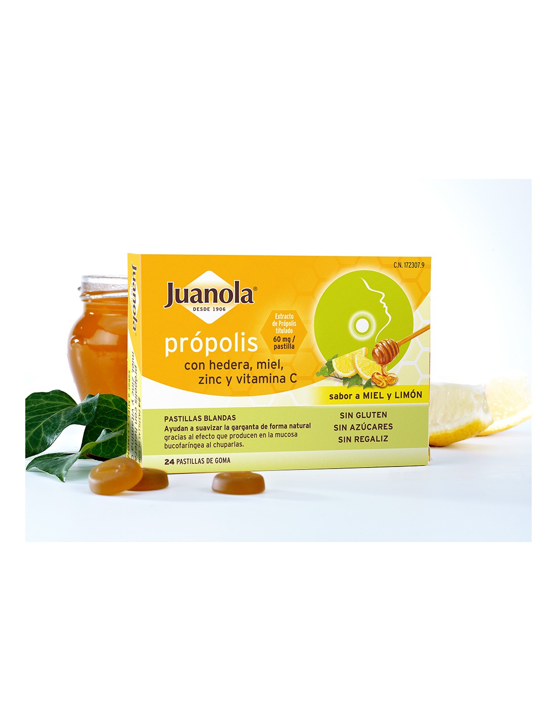 JUANOLA PROPOLIS MIEL HIEDRA ZINC Y VITAMINA C 24 PASTILLAS DE GOMA SABOR MIEL Y LIMON