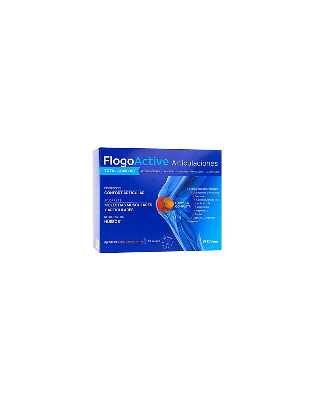 FlogoActive Articulaciones es un complemento alimenticio formulado especialmente para el cuidado y mantenimiento de las articulaciones, cartílagos y huesos. Su combinación de Glucosamina, Condroitina, Ácido Hialurónico, Cúrcuma, Magnesio, Bambú y Vitamina C ayuda a proteger y fortalecer el sistema musculoesquelético, favoreciendo la movilidad y mejorando la calidad de vida.