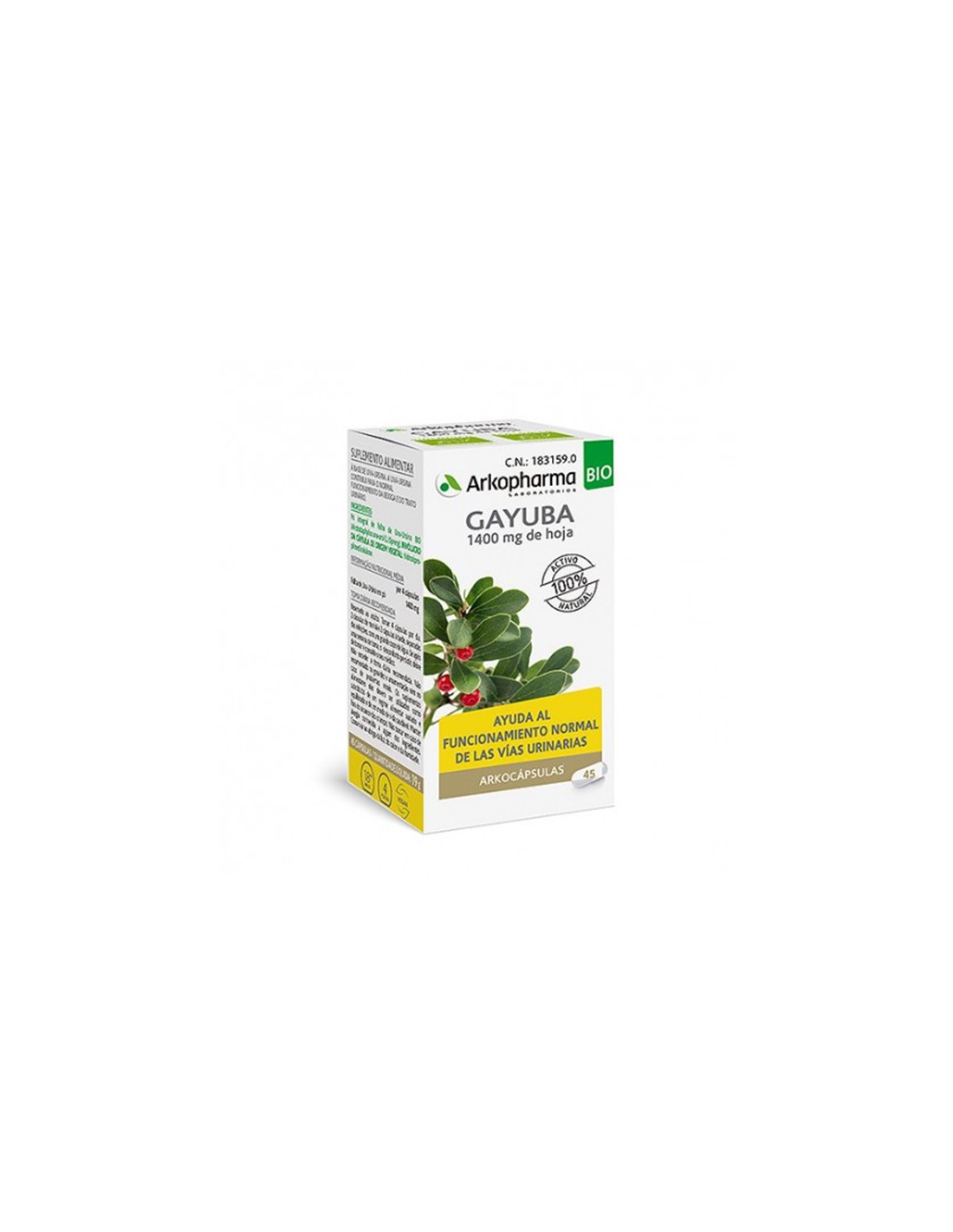Arkocápsulas Gayuba 45 Cápsulas es un producto que contiene gayuba o uva de oso. Estas bayas rojas son procesadas por Arkopharma para poder obtener las propiedades sinérgicas del fruto y hacerlo más fácil de consumir. De hecho, en cada cápsula encontramos 350mg de Guyaba. Este tratamiento reduce en una semana las molestias que se pueden presentar al orinar, también puede contribuir con el buen funcionamiento de la vejiga. Además es apto para veganos.