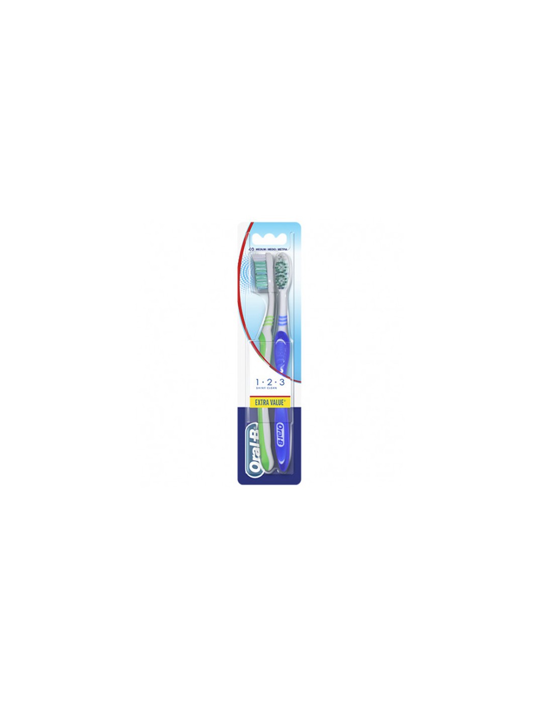 Oral B Cepillo Shiny Clean 1 2 3 Medio 2uds es un cepillo de dientes con filamentos de dureza media que limpian los dientes en profundidad, llegando a los espacios interdentales sin problemas. Logra una limpieza impecable gracias a copas de pulido y elimina la placa bacteriana hasta 3 veces más que la competencia. Se presenta con 2 unidades.